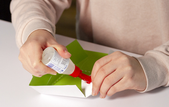 Die durchgezogenen Linien müsst ihr einschneiden und entlang der gestrichelten Linien falten. Danach müsst ihr die inneren Flappen am Rand festkleben, damit das Osterkörbchen stabil wird.